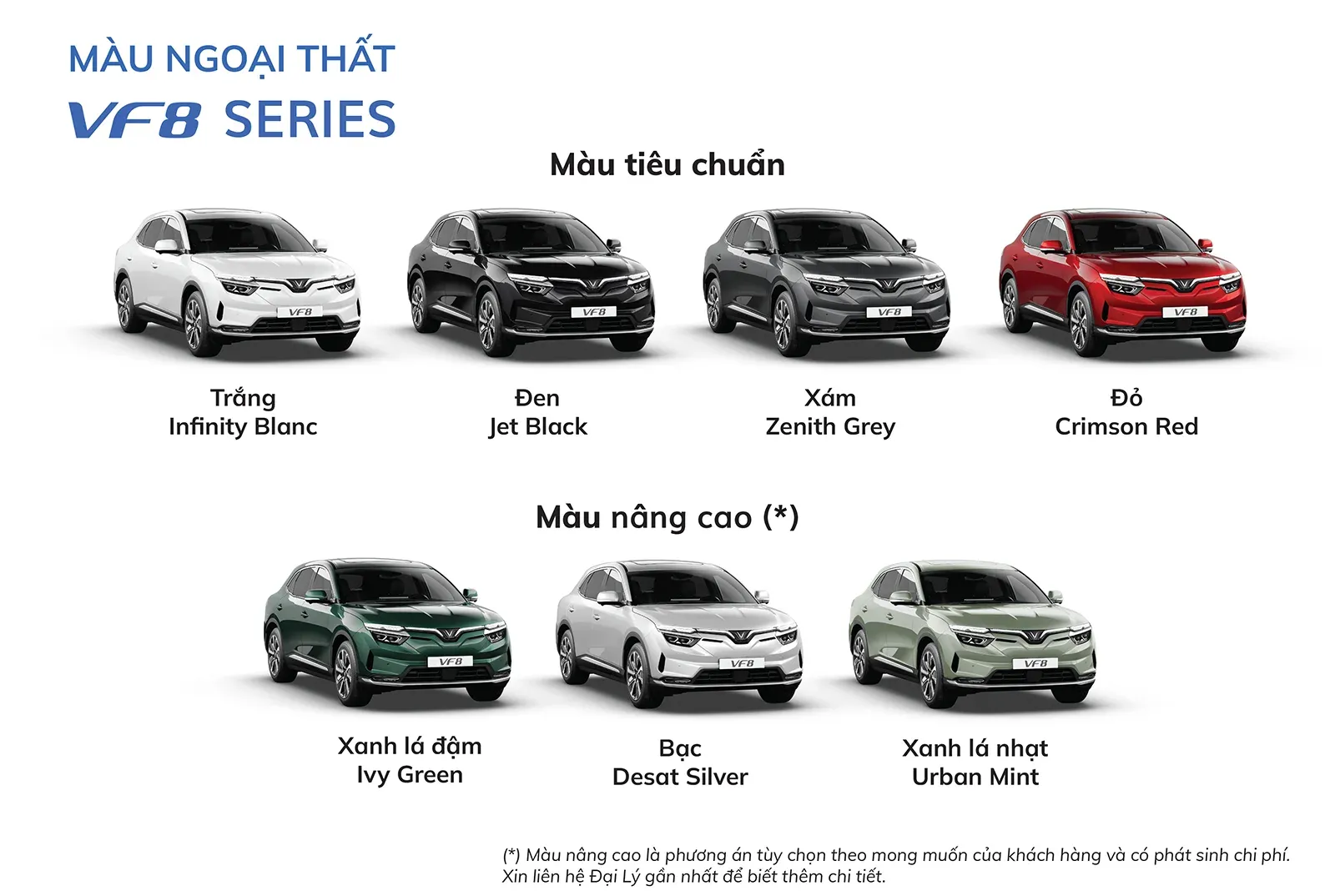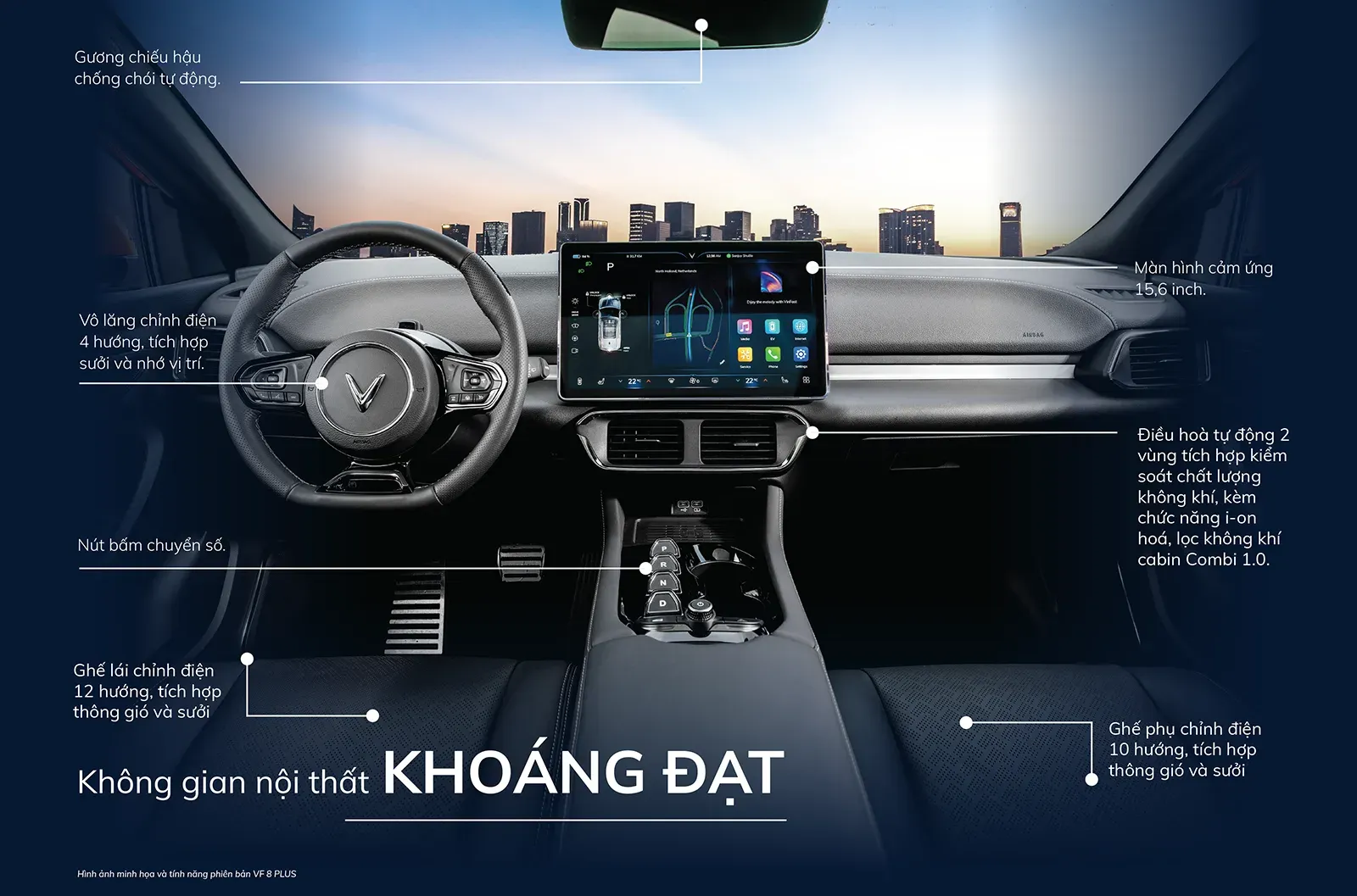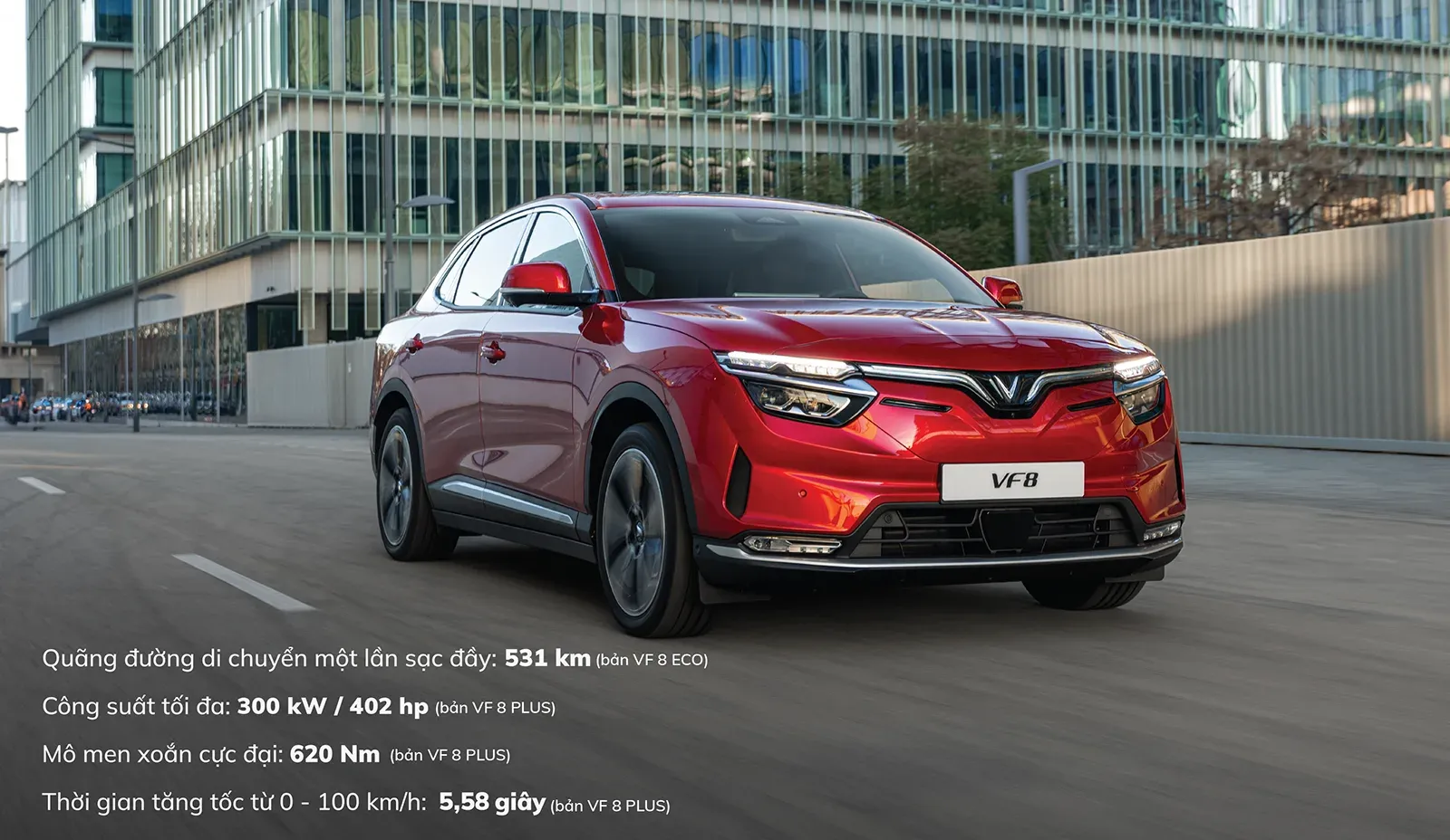 VinFast VF 8 là mẫu SUV điện thông minh tầm trung, nổi bật với hiệu năng mạnh mẽ và công nghệ tiên tiến hàng đầu. Phiên bản VF 8 Plus trang bị hai động cơ điện toàn thời gian (AWD), công suất tối đa 300 kW (402 hp), mô-men xoắn 620 Nm, tăng tốc 0–100 km/h chỉ trong 5,58 giây. Xe có quãng đường di chuyển đến 562 km (NEDC) cùng ba chế độ lái Eco / Normal / Sport.